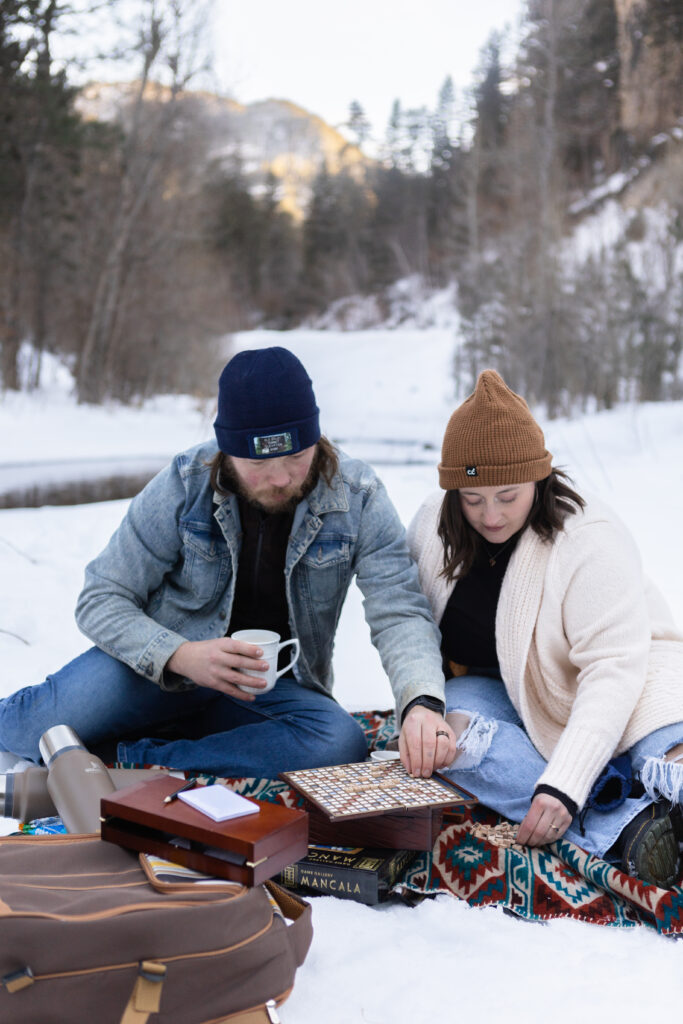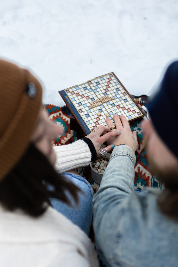 Take Julia + Asher, for example. They brought their favorite board games and a thermos of hot chocolate, turning their session into a sweet, snowy picnic. Not only did they stay warm and relaxed, but they also got to enjoy a moment that felt totally them.